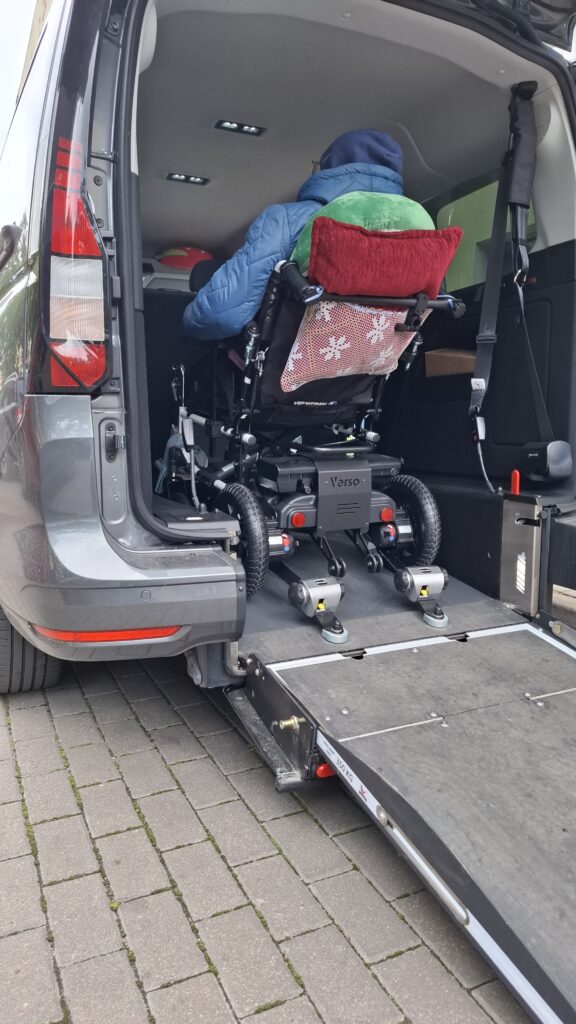 Samochód wyposażony w rampę i miejscem dla osoby poruszającej się na wózku inwalidzkim.