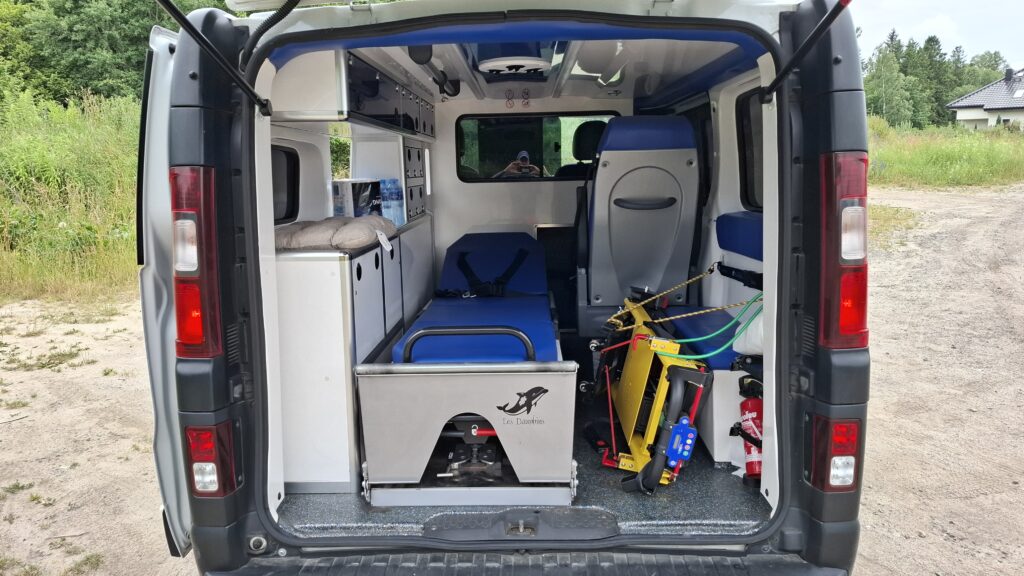 Samochód jest wyposażony w specjalistyczne nosze, które umożliwiają bezpieczne i wygodne transportowanie osób po schodach z/na piętro.